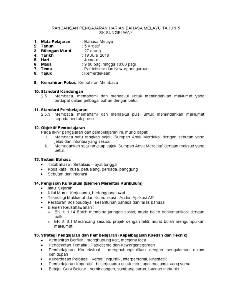 Bersama-sama ini disertakan satu pautan google drive yang mengandungi contoh RPH dan Examplar mata pelajaran Pendidikan Sivik Bahasa. 22 Membaca dan memahami perkataan frasa dan ayat daripada pelbagai. Rancangan Pengajaran Harian Bahasa Melayu Tingkatan 1 Keywords.
